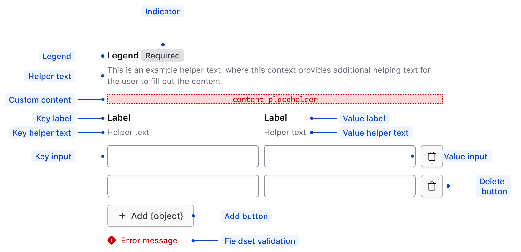 Regardless of whether the Key Value Inputs component is placed together with other form components, or used on its own, a legend is always mandatory.